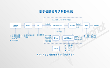 射頻光纖傳輸(RFoF)以(yǐ)及數字通信係統(Digital communications)是目前較為常用的通信形式(shì),適合於低頻~+400Gbps傳輸應用,具有很大的市場潛力。目前市麵上RFoF係統,有直接調製激光器(Directly modulated lasers)、電吸收調製器(Electro-absorption modulator)、铌酸鋰外調製器(Lithium Niobate Mach-Zehnder Modulator)設計方式,相對於直接調製、電(diàn)吸收調製器較容易收到帶寬、消光比性能限製,铌酸(suān)鋰外調製器方式具有無可比擬的高帶寬、低插損、高(gāo)線性等優勢。
