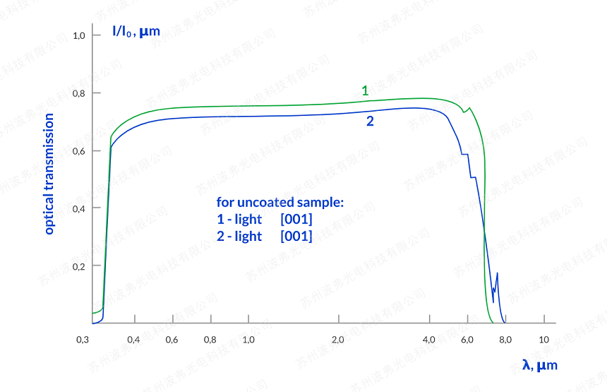 標準TeO2材料在0.450-5 mkm範(fàn)圍內更好;標準TeO2晶體在特殊技術(shù)下生(shēng)長,最大透射率在0.350 - 0.450 mkm範圍內,適用於對澄清效應敏感的應用;在特殊技術下生長的標準TeO2晶(jīng)體最大限度地減少了2.7 - 3.2 mkm範圍內的(de)-OH基團,以(yǐ)滿足應用所需的平麵傳輸(shū)範圍。