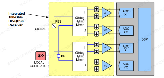 集成(chéng)的100-Gb/s DP-QPSK接收器將兩個90°光混合器與(yǔ)四對平衡(héng)光電探測(cè)器(PD)和(hé)四個線性TIA集成到(dào)單個蝶形封裝中。 與(yǔ)其他不包含偏振(zhèn)分束器(PBS)和/或功率分束器(BS)的技(jì)術不同,Optoplex的接收器包含這兩(liǎng)種技術以(yǐ)及光混合器、PD和TIA,以(yǐ)提供完全集成的解決方案,這將使用(yòng)戶受益 在完全消除光纖路由和傾斜(xié)管理方(fāng)麵。 集成接收器以高達32GBaud/s的波特率工作。