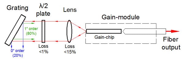 該設備包括帶(dài)有彎(wān)曲條紋的“C型”增益芯片。條紋傾斜的刻麵(miàn)專為外部反饋而設計,並具有(yǒu)深層 AR 塗層,從而使芯片波導的背反射極低。它確保了自(zì)激的(de)阻斷,並(bìng)消除了在外腔係統中操作時(shí)與複合腔相關的(de)問題。這導致在整(zhěng)個調諧範圍內具有高(gāo)邊模抑製比 (SMSR) 的非常精細的譜線(xiàn)。具有垂(chuí)直條紋的刻麵具有適當的反(fǎn)射率(lǜ)(通常在 5-15% 的範圍內),以同時提供寬波長調諧(xié)和(hé)高輸出功率。標準(zhǔn)器件(jiàn)中這一方麵的(de)反射針(zhēn)對在外腔設置(zhì)中的操作進行了優化,該設置為芯片提供了有(yǒu)效的反饋(約 50%)(如圖所示)。對(duì)於反饋較低的方案,我們(men)建議使用在刻麵上具有不同塗層的(de)定製設備,以提(tí)供優化的反射(shè)。