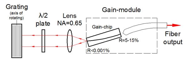 該設備包括帶有彎曲條紋的“C型”增益芯片。條紋傾斜的刻麵專為外部反饋而設計,並具有(yǒu)深層 AR 塗層(céng),從而使芯片波導的背反射極低。它確保了自激的阻斷,並消除了在外腔係統中操作(zuò)時與複合(hé)腔相關的問題。這導致在整個調(diào)諧範(fàn)圍(wéi)內具有高邊模抑製比 (SMSR) 的非常精細(xì)的譜線。