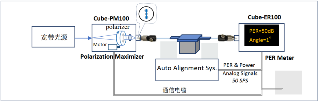 在測量保偏器件的偏振消光比(PER)時 ,較(jiào)低的(de)光源線偏振度 ,以及線偏振光與保偏光纖光軸之間的(de)對軸角度偏(piān)差(chà)是PER測量誤差(chà)的主要(yào)來源。為了最大(dà)限度的消除這兩種測量誤差源, 本公司自豪(háo)地推出了業界首個自動化偏振消光比測量係統。