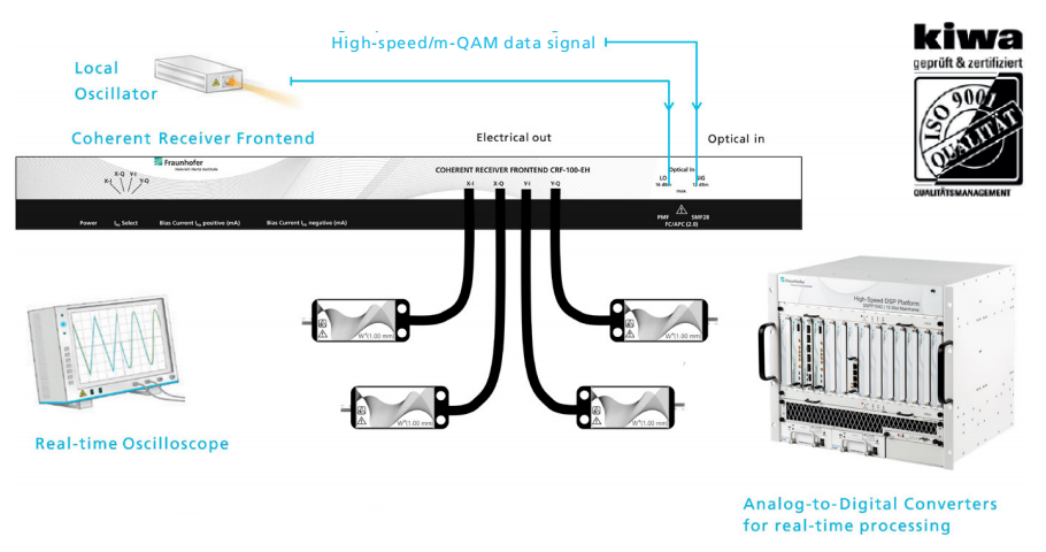 緊湊型(xíng)19英寸(cùn)機箱中的光學相幹接收機,100 GHz帶寬,包(bāo)括C或L波段(duàn)可選LO激光(guāng)器,高速光學雙偏振(zhèn)m-PAM和m-QAM信號的(de)相幹檢測。