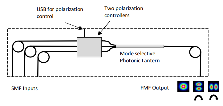 模(mó)式(shì)複用器/解複用器是圍繞Phoenix Photonics模(mó)式選(xuǎn)擇(zé)全光纖提燈和PC控製的全光纖精密偏振控製器(qì)構建的。FMF的高階模式(shì)(LP11和LP21)在傳播期(qī)間旋轉。控製輸入的偏振狀態允許模式(shì)的旋轉以在接收器(qì)處進(jìn)行最優(yōu)解複用。